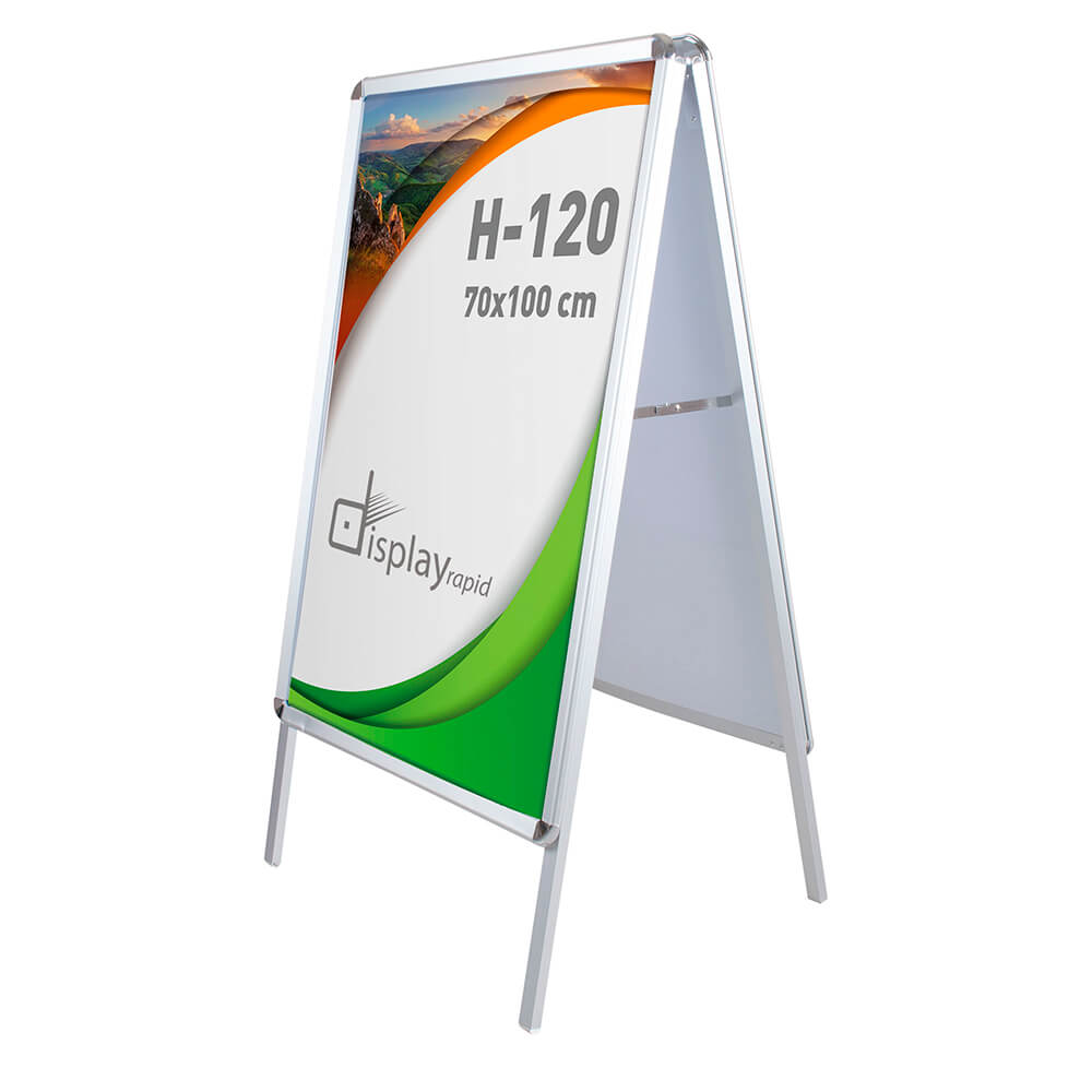 Caballete de acera de una o dos caras disponible en dos tamaños: 50×70 cm.y 70×100 cm. Los caballetes son ideales para anunciar eventos, menús de restaurante, o colocar ofertas en zonas de paso. Imprimimos la gráfica en lona de exterior de primera calidad. Tienen una gran efectividad como llamada de atención del público. Se suministra con una bolsa de transporte, incluida en el precio. En el precio está incluido el IVA y los gastos de envío.